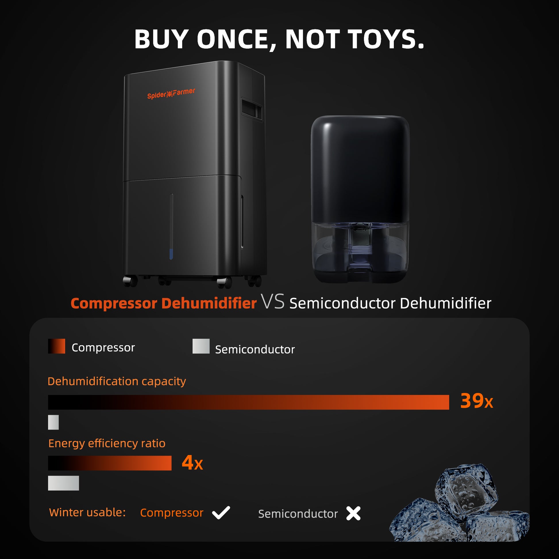 Kompressoravfuktere er langt mer effektive enn halvlederavfuktere, og tilbyr 39 ganger større avfuktingskapasitet. Du har kanskje tidligere kjøpt en halvlederavfukter og funnet ut at den knapt var effektiv. Derfor anbefaler vi kompressoravfuktere: de behandler store luftmengder raskt, gir bedre avfukting og er svært effektive.