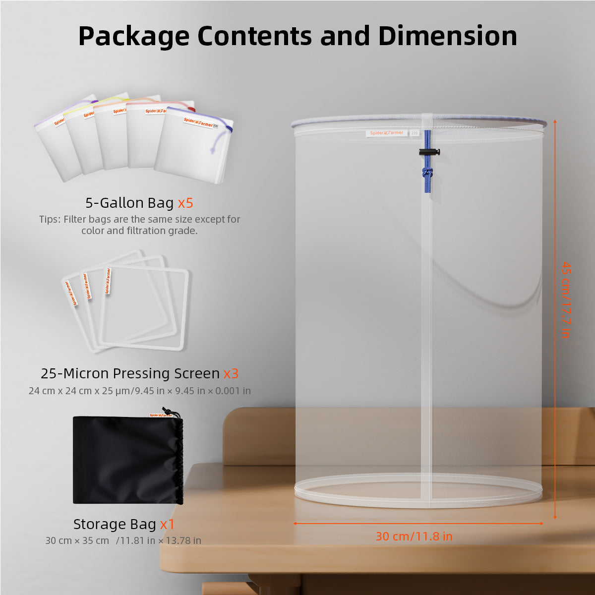 Inkluderer 5 fargekodede filterposer med tydelig merkede mikronverdier: 220μm, 160μm, 120μm, 73μm og 25μm — perfekt for lagdelt separasjon og presisjonsfiltrering.